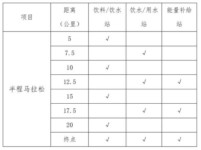 自起点开始每5公里设置一个饮料站,两个饮料站中间设置一个饮水/用水站。