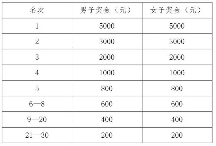 本次赛事在半程马拉松组别男女参赛选手中各录取前30名运动员(男女前八名以枪声成绩为准,其他排名以净计时成绩为准),分别获得奖金(见下表,单位:人民币元),男、女前三名选手各颁发赛事奖杯一座;