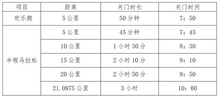 (六)赛时分段关门与时间:为了保证参赛选手赛时安全,比赛路线将按公里点位置设置分段关门时间,分路段、分时段对社会交通进行临时管制。关门时间按自然时间计算,关门时间到后,相应公里点的计时毯停止工作,相应路段将恢复社会交通。未跑到相应公里点的选手须退出赛道,以免发生危险。退出赛道的选手可到路线沿途补给站搭乘援助车到终点取衣。如遇突发紧急情况和不可抗力事件,组委会有权提前关门或停止比赛。