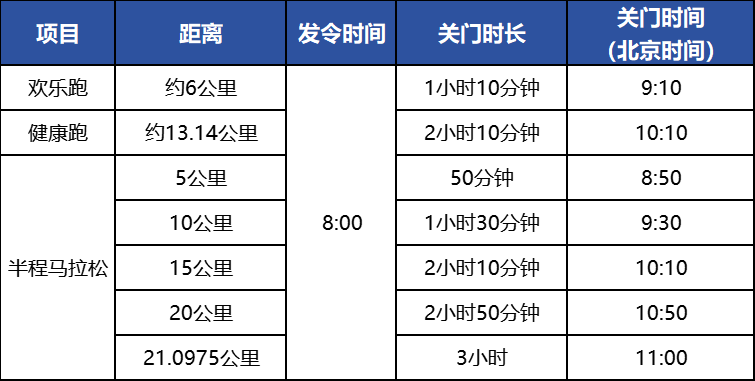 为了保证参赛选手比赛安全、顺利,比赛期间比赛路线各段实行限时交通封闭,关门时间到后,相应路段将逐段恢复开放社会交通。参赛选手在规定的关门时间内,未跑完对应的距离者须立即停止比赛,退出赛道,以免发生危险。退出比赛的选手可乘坐组委会提供的赛事援助车到终点处,关门时间以枪声成绩为准,各项目关门时间见下表: