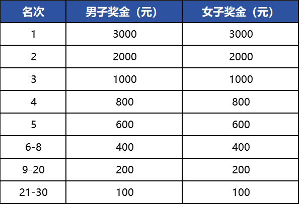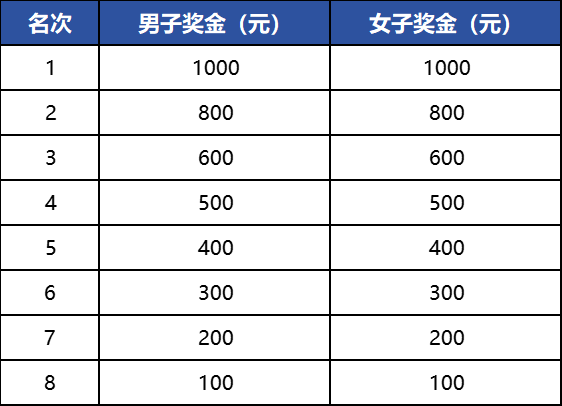 本次赛事在健康跑组别男女选手中各录取前8名运动员(均以净计时成绩为准),分别获得奖金(见下表)。
