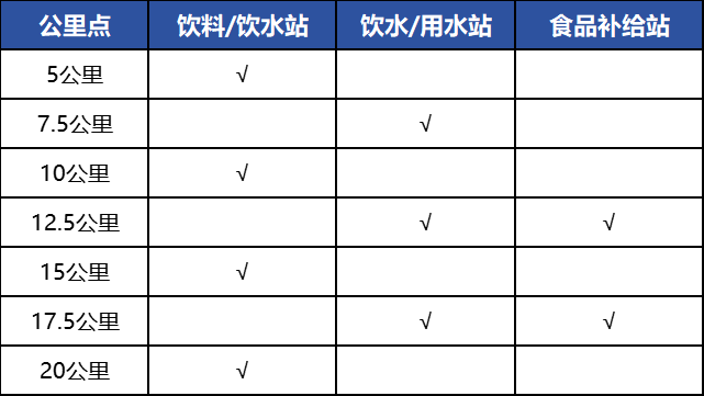 自起点开始每隔5公里的间隔距离设置一个饮料/饮水站(提供功能性饮料),两个饮料/饮水站中间设饮水/用水站。