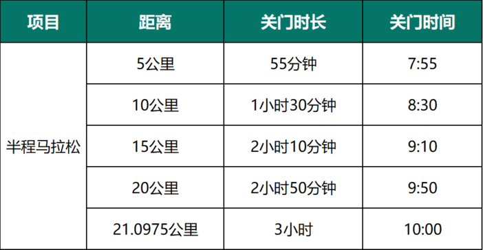 为了保证参赛选手比赛安全、顺利,比赛期间比赛路线各段实行限时交通封闭,关门时间到后,相应路段将逐段恢复开放社会交通。参赛选手在规定的关门时间内,未跑完对应的距离者须立即停止比赛,退出赛道,以免发生危险。退出比赛的选手可乘坐组委会提供的赛事援助车到终点处,关门时间以枪声成绩为准,各项目关门时间见下表: