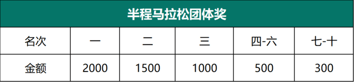 半程马拉松设置团体奖。团体报名的选手(≥20人,其中女性至少3人),赛前对符合要求的团队进行公示,赛后取最好成绩的8位男子和2位女子的净成绩进行累加排名,给予对应奖励。如果男子不足8位的部分用女子成绩,女子至少贡献2个有效成绩。所有符合条件的队伍取前十名,分别予以奖励。
